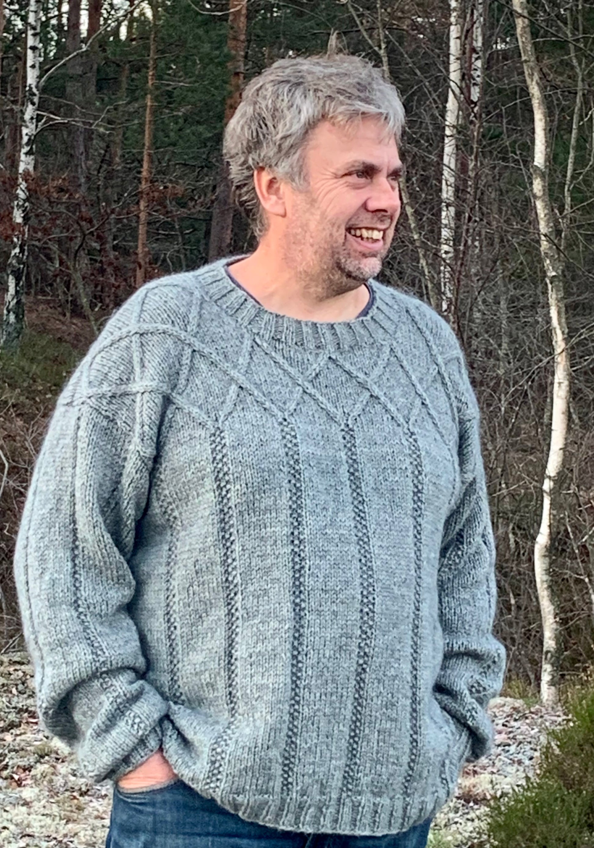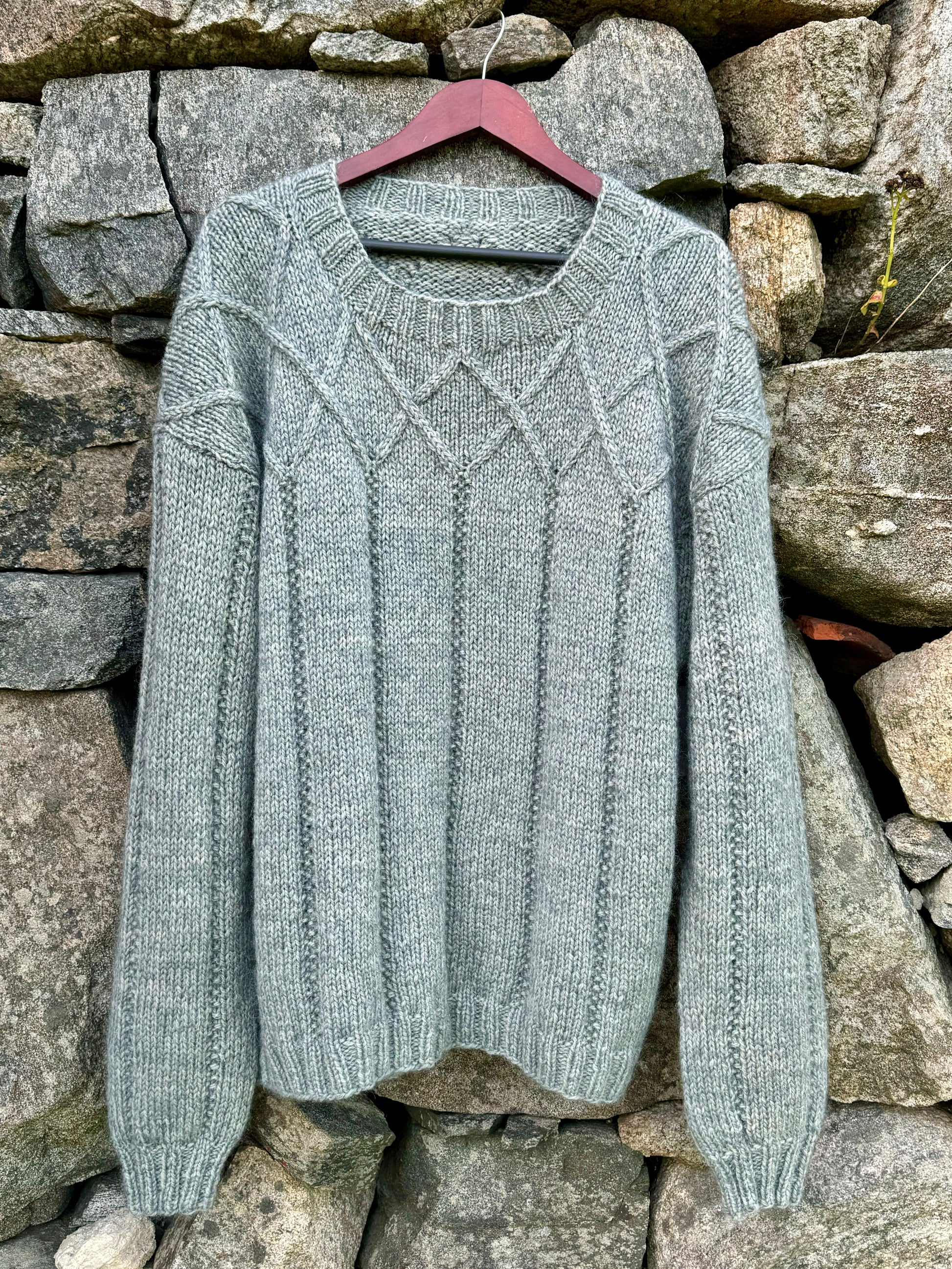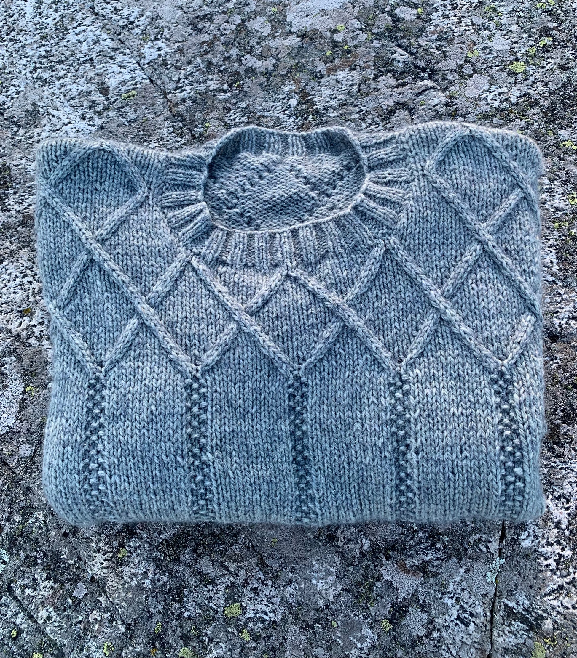 Håndstrikett herregenser i økologisk ull sammen med tynn silk mohair.
