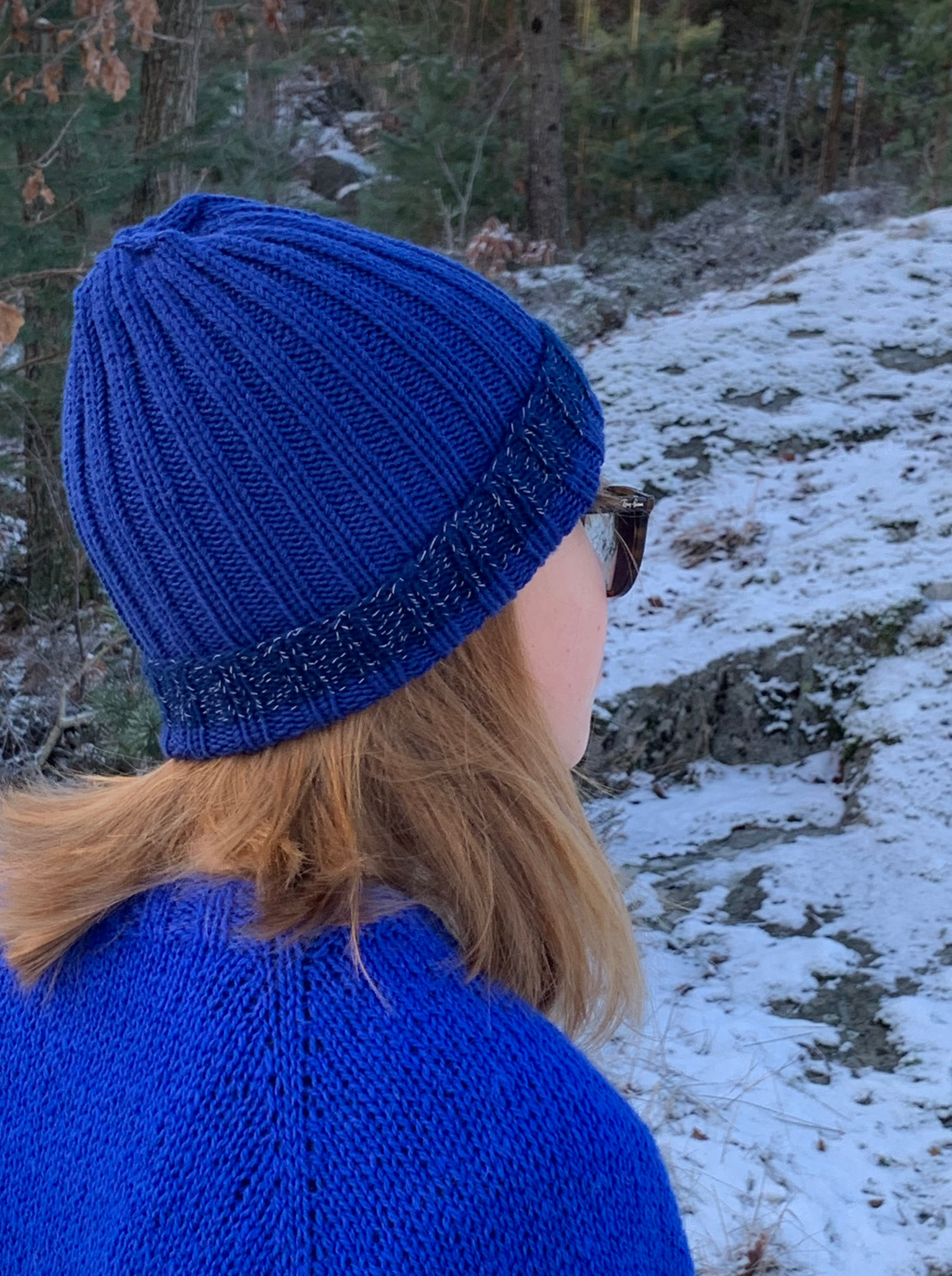 Veiledning til å strikke en lue med reflex i brettekanten.